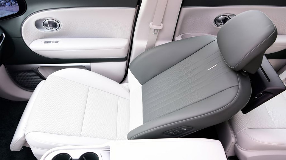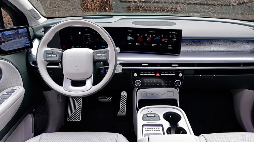 Le tableau de bord numérique intègre un écran pour l’instrumentation et un large écran tactile central pour l’infodivertissement, avec système d’exploitation basé sur connectivité avancée et mises à jour over-the-air. On trouve également un affichage tête haute, recharge sans fil pour smartphone, nombreux ports USB et un système audio premium. Le plancher plat dérivant de l’architecture E-GMP garantit un espace optimal pour les jambes et les pieds dans toutes les rangées.