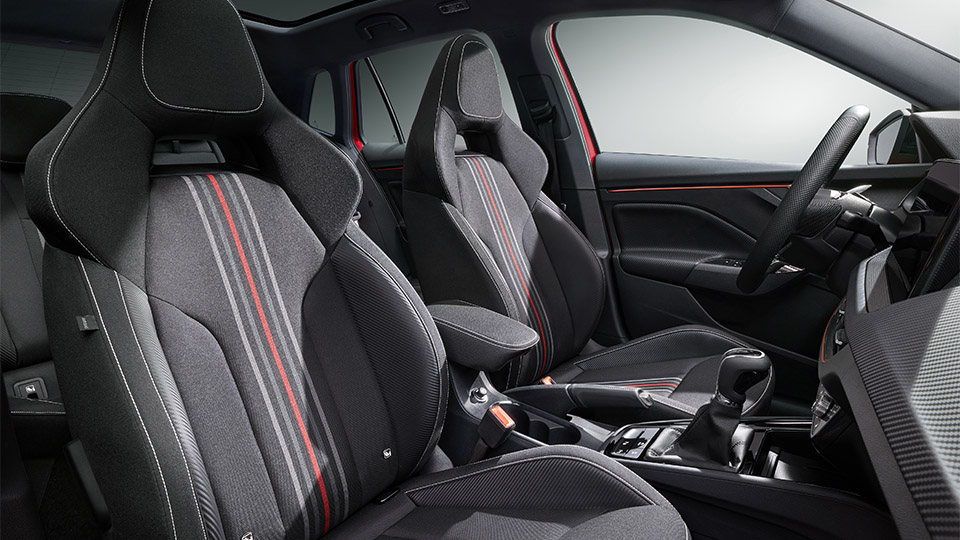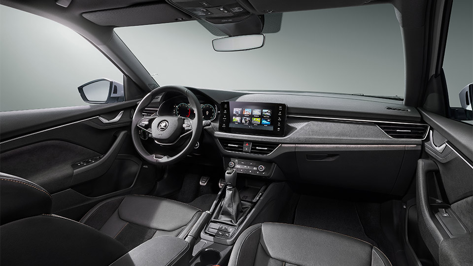 Ce nouveau look, plus robuste, repose aussi sur une calandre plus généreuse, noire brillante et contrastée avec la carrosserie, ainsi que sur des projecteurs et une prise d’air redessinés : l’ensemble paraît plus massif et apporte davantage de présence sur la route. L’arrière a également été revu : les feux conservent leur signature en forme de boomerang, mais l’emblème Skoda est désormais remplacé par le lettrage de la marque.